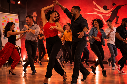 Corporate Team-Building Movement Experiences bring teams together through rhythm, creativity, and movement. This high-energy experience blends salsa, urban line dancing, and interactive group choreography to help teams build trust, improve communication, and celebrate collaboration in a fun and engaging way.